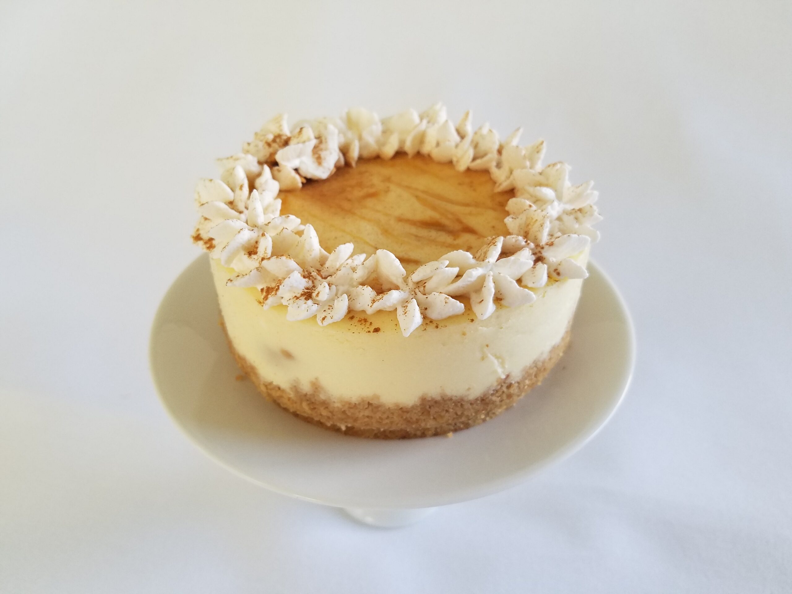 Homemade cheesecake marbled with pumpkin-flavored filling, baked in a 4 inch pan.